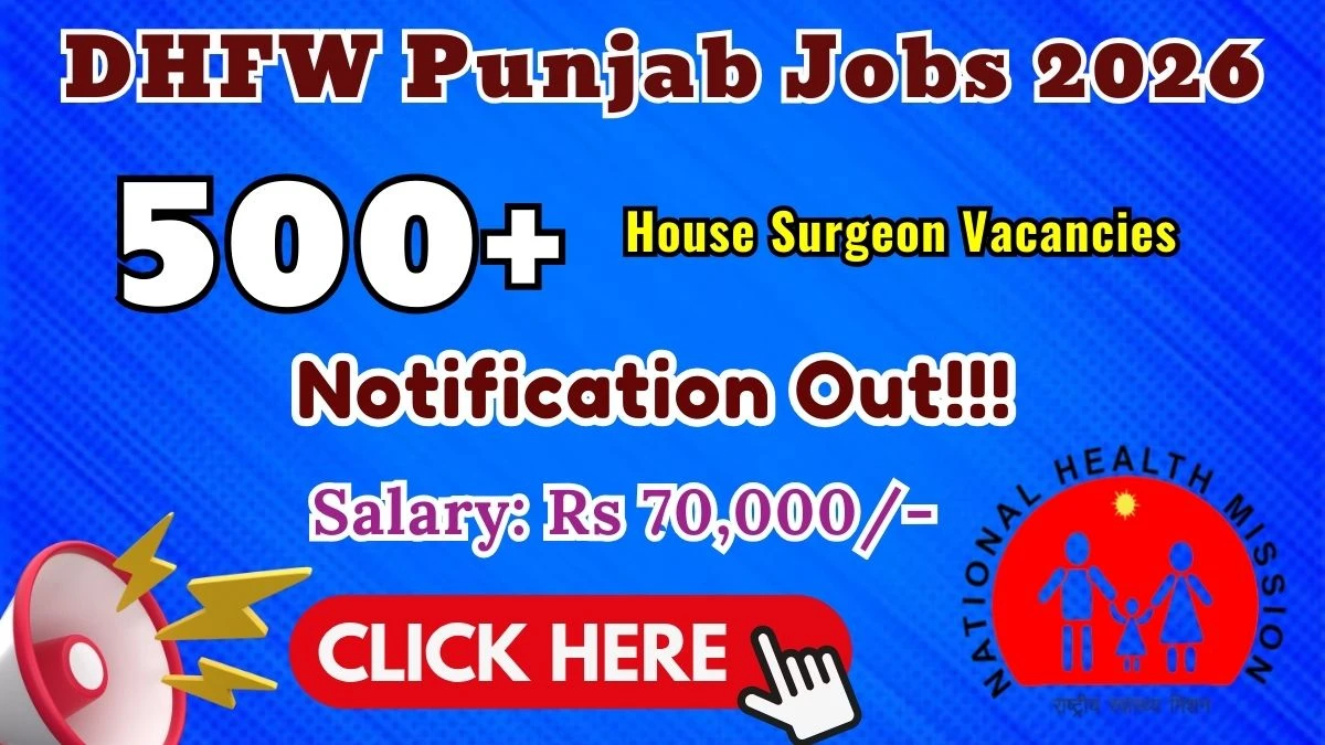 Department of Health and Family Welfare Punjab (DHFW Punjab) invites applications from eligible candidates for 523 vacancies in House Surgeon posts. Candidates can submit their applications online/ offline through the official portal at nhm.punjab.gov.in. The application process starts from 10-01-2026 and the deadline to apply is 20-01-2026. Read the complete details about DHFW Punjab House Surgeon Recruitment 2026 including post details, educational qualifications, age criteria, selection procedure, and application process below.