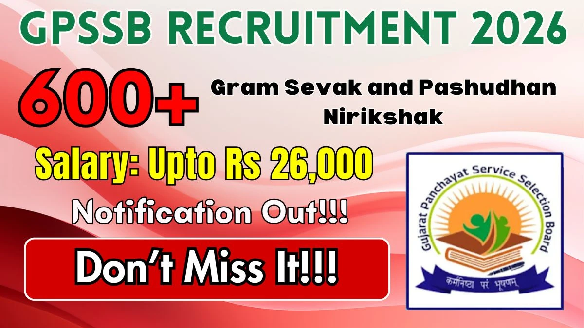 Gujarat Panchayat Service Selection Board (GPSSB) invites applications from eligible candidates for 612 vacancies in Gram Sevak and Pashudhan Nirikshak posts. Candidates can submit their applications online/ offline through the official portal at https://gpssb.gujarat.gov.in/. The application process starts from 16-04-2026 and the deadline to apply is 07-05-2026. Read the complete details about GPSSB Gram Sevak and Pashudhan Nirikshak Recruitment 2026 including post details, educational qualifications, age criteria, selection procedure, and application process below.