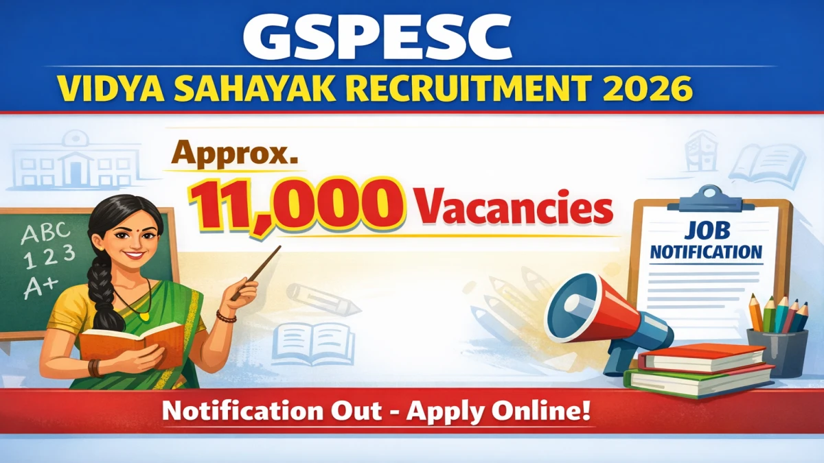 Gujarat State Primary Education Selection Committee (GSPESC) invites applications from eligible candidates for 11000 vacancies in Vidya Sahayak posts. Candidates can submit their applications online/ offline through the official portal at https://dpegujarat.in/. The application process starts from 15-04-2026 and the deadline to apply is 24-04-2026. Read the complete details about GSPESC Vidya Sahayak Recruitment 2026 including post details, educational qualifications, age criteria, selection procedure, and application process below.