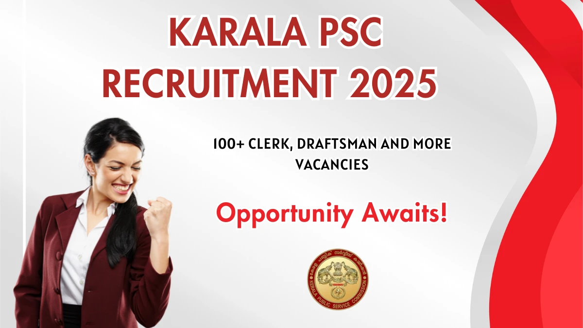 Kerala Public Service Commission (Kerala PSC) invites applications from eligible candidates for Various vacancies in Clerk, Draftsman and More posts. Candidates can submit their applications online/ offline through the official portal at keralapsc.gov.in. The application process starts from 15-12-2025 and the deadline to apply is 14-01-2026. Read the complete details about Kerala PSC Clerk, Draftsman and More Recruitment 2025 including post details, educational qualifications, age criteria, selection procedure, and application process below.